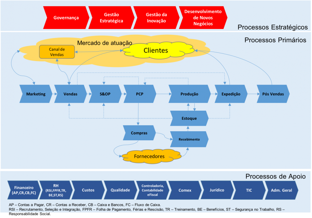 Abaixo um exemplo de uma estrutura organizacional, para uma indústria, com seus respectivos Macro Sistemas de Trabalho (Cadeia de Valor). A cadeira de valor é similar, mas difere de organização para organização. Ao se mapear os Macros Sistemas de Trabalho e explodi-los em Sistemas de Trabalhos menores é comum encontrar entre 150 a 300 Sistemas de Trabalho em uma organização.